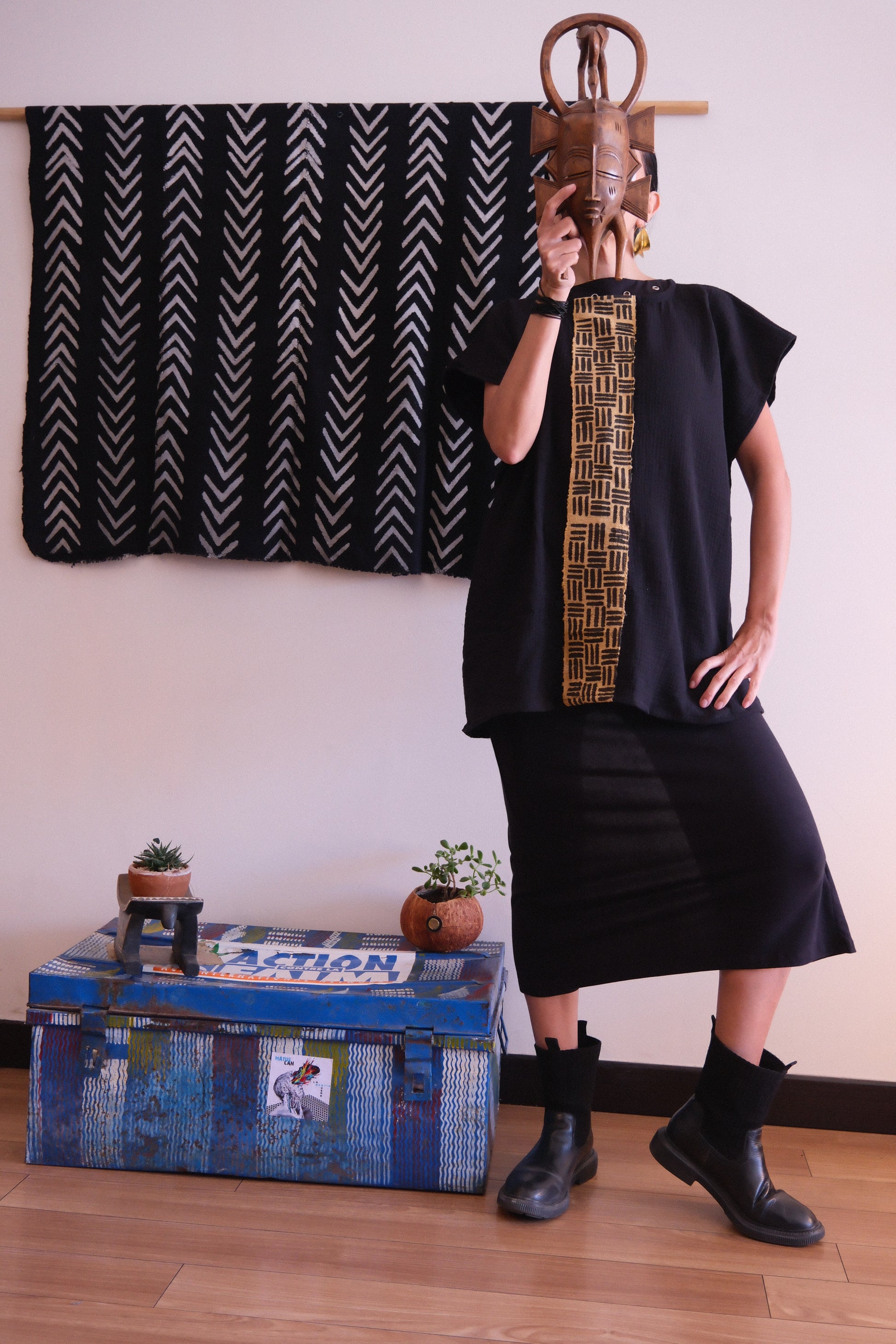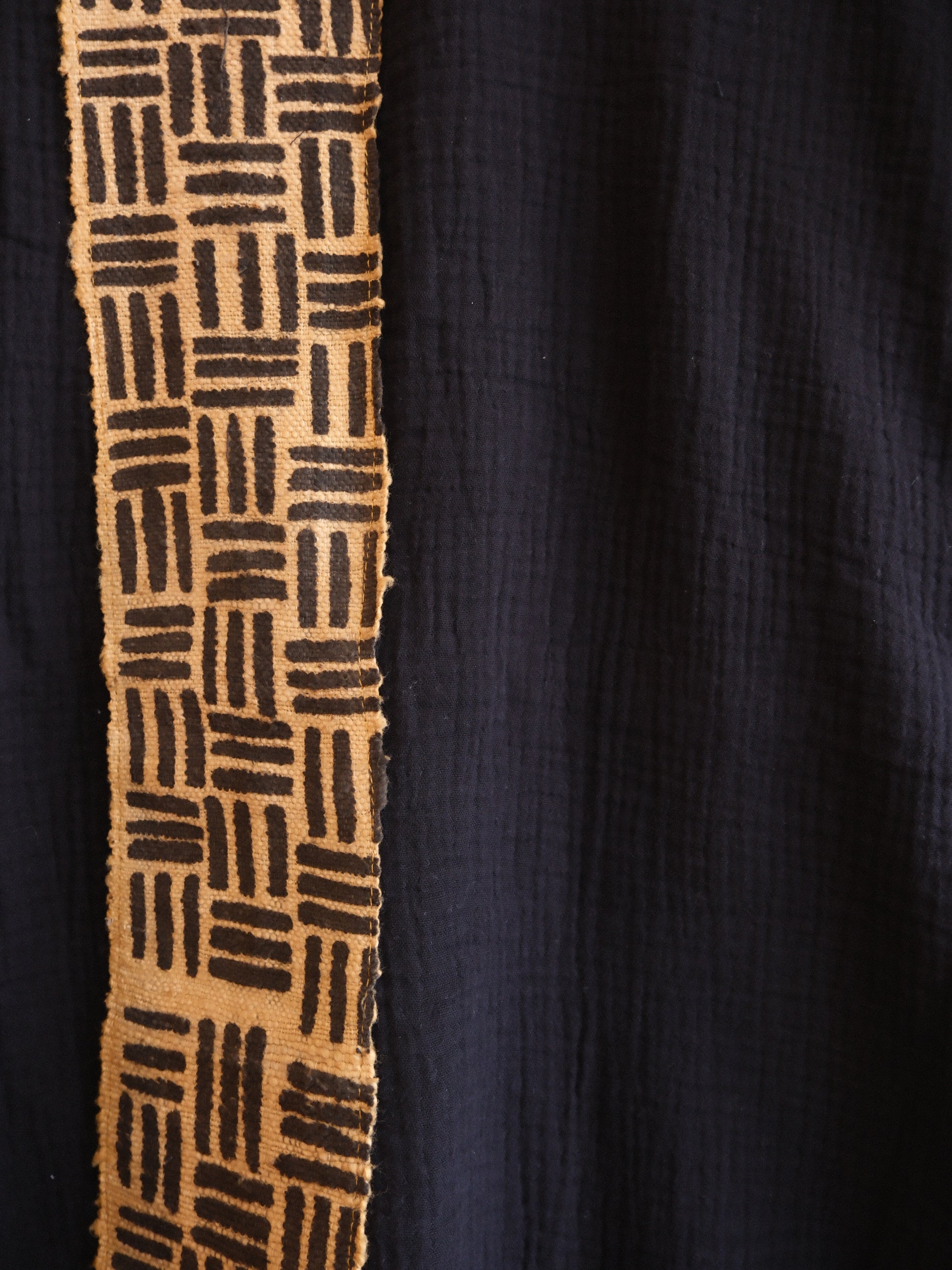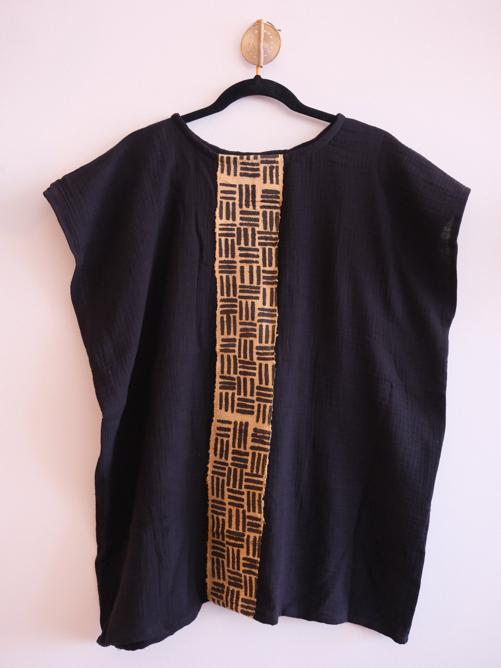 Nuestro blusón fuugu es ligero, cómodo y elegante. Está fabricado con un algodón comercial y lleva una aplicación de textil bogolán. El bogolán es un textil tejido en telar de pedal y teñido con tintes de origen vegetal en Burkina Faso.