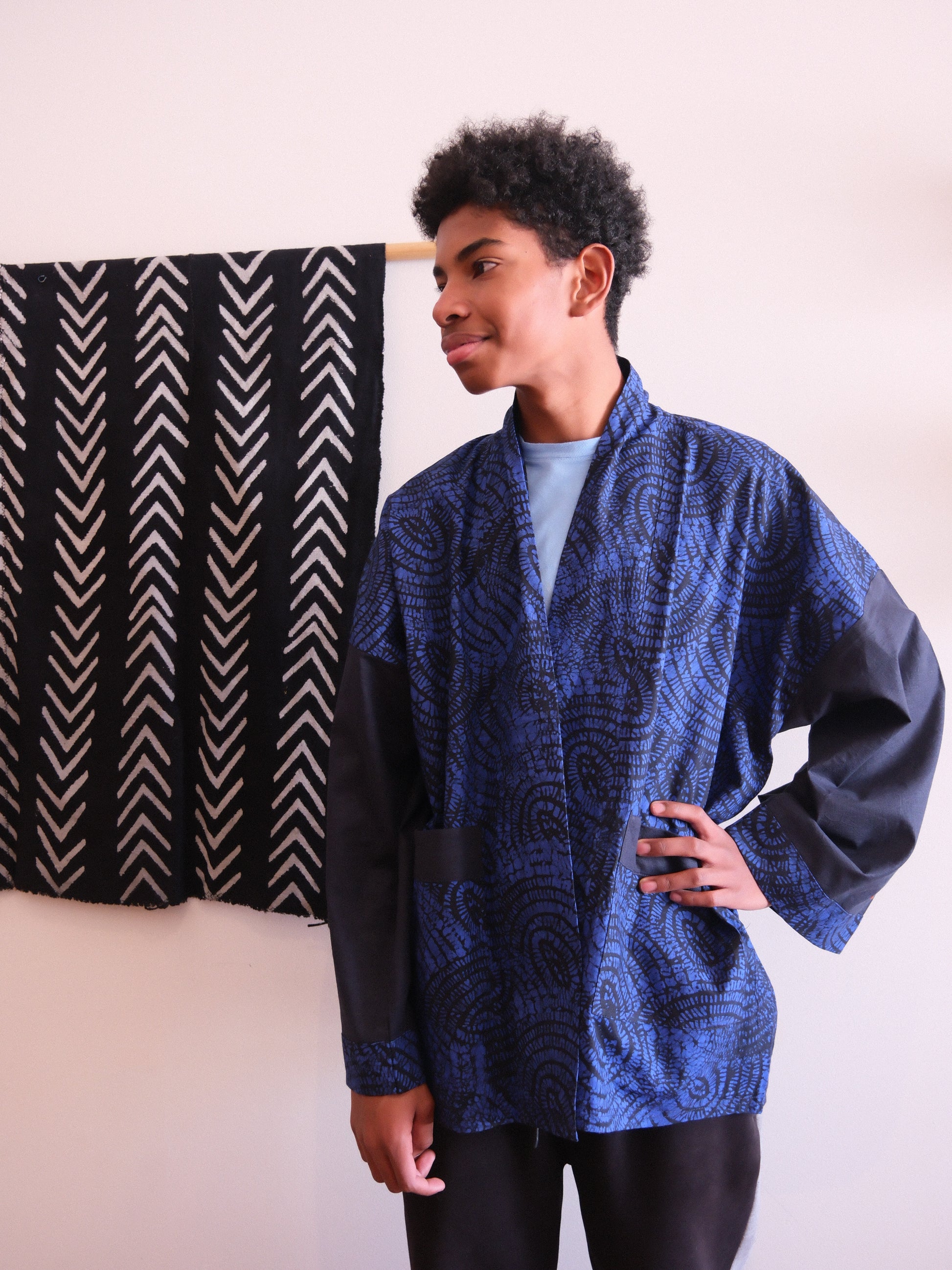 Kimono fabricado con lino y batik. El batik es fabricado artesanalmente en los talleres de Afrofutur en Cotonou, Benín.